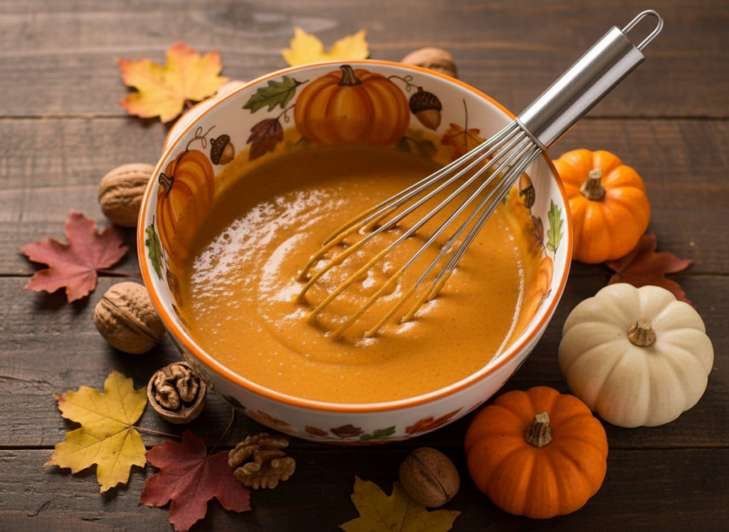 In your favorite glass mixing bowl, whisk the pumpkin and eggs until they become one smooth, silky base. Add the brown sugar. Stir until it deepens in color. Then sprinkle in the cinnamon, ginger, nutmeg, cloves, and that quiet pinch of pepper.